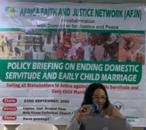 In September 2025 the Africa Faith and Justice Network, Nigeria (AFJN-N) held an “Ending Domestic Servitude and Early Child Marriage” policy briefing at Jubilee Hall, Holy Ghost Cathedral, in Enugu State, Nigeria. The event drew stakeholders from different organizations including the National Agency for the Prohibition of Trafficking in Persons (NAPTIP), traditional rulers, law enforcement agencies, the judiciary, civil society groups, church leaders and the media.