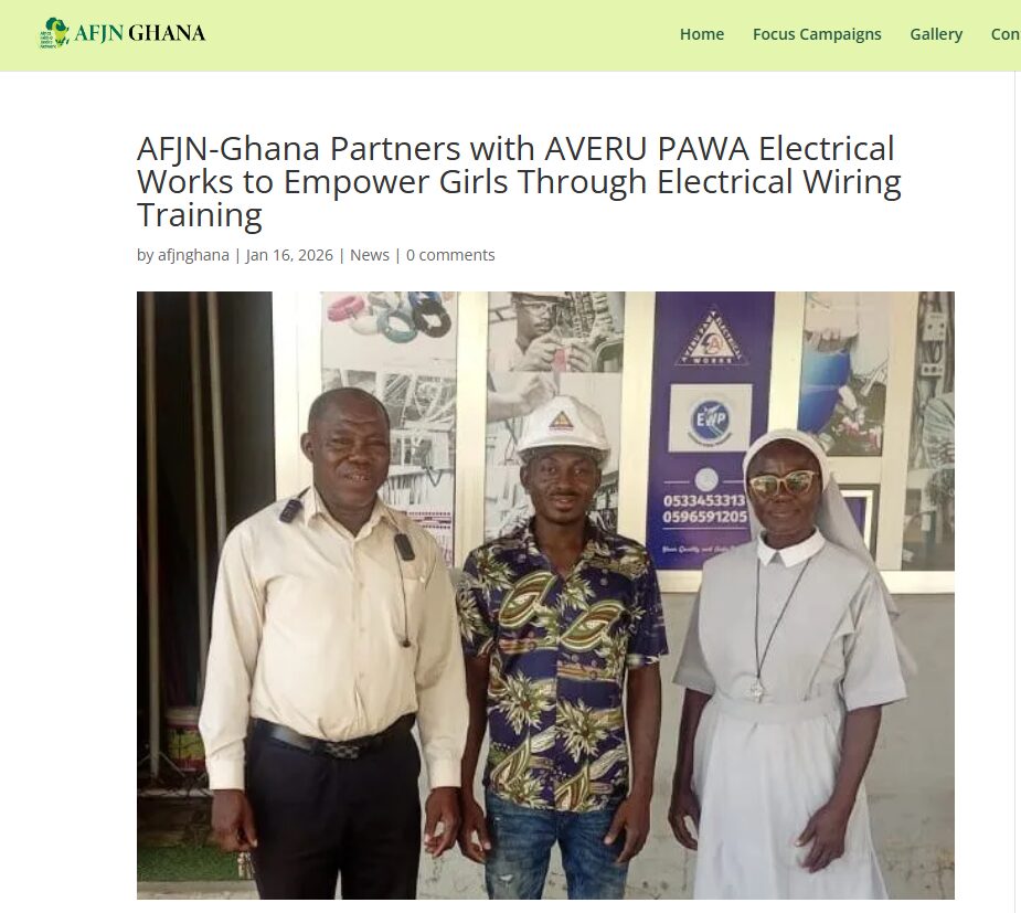 On January 16, 2026, Africa Faith and Justice Network Ghana wrote “AFJN-Ghana Partners with AVERU PAWA Electrical Works to Empower Girls Through Electrical Wiring Training.” This training is part of the Africa Faith and Justice Network’s Women Empowerment Project read the article here: https://afjnghana.org/afjn-ghana-partners-with-averu-pawa-electrical-works-to-empower-girls-through-electrical-wiring-training/.